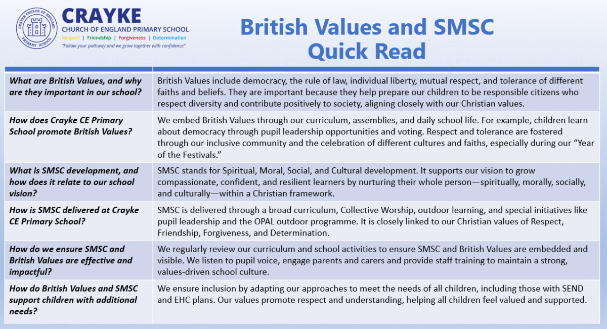 At Crayke Church of England Primary School we take very seriously our responsibility to prepare children for life in modern Britain. We ensure that the fundamental British Values are introduced, discussed and lived out through the ethos and work of the school. All curriculum areas provide a vehicle for furthering understanding of these concepts and, in particular, our RE, PSHE and RSE lessons provide excellent opportunities to deepen and develop understanding. Children embrace these concepts with enthusiasm and demonstrate a good understanding of their application to their own lives.