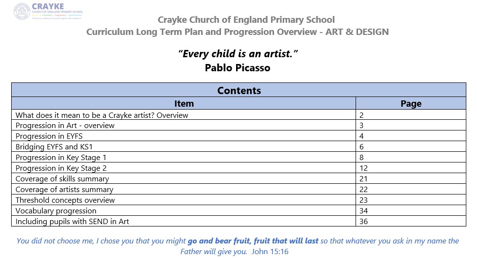 This page provides details about what Art looks like at Crayke Primary. It includes our Intent Statement, our coverage and progression document and our “jigsaw” explaining how teaching and learning in Art links to our four core values of Friendship, Forgiveness, Respect and Determination.