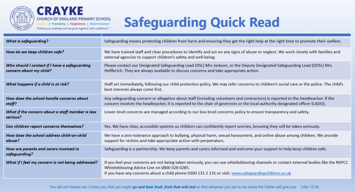 A reminder that if you have any concerns about a child, please do not hesitate to get in contact by emailing dsl@crayke.n-yorks.sch.uk